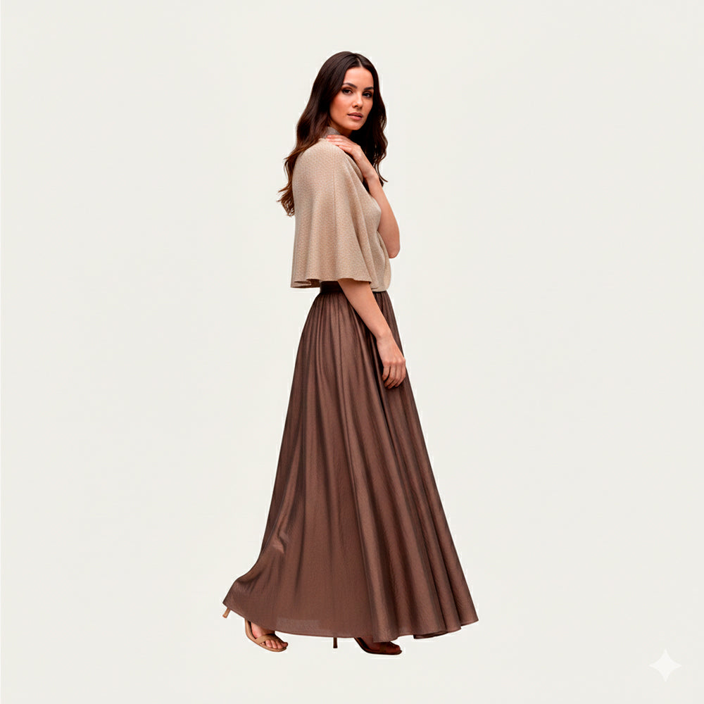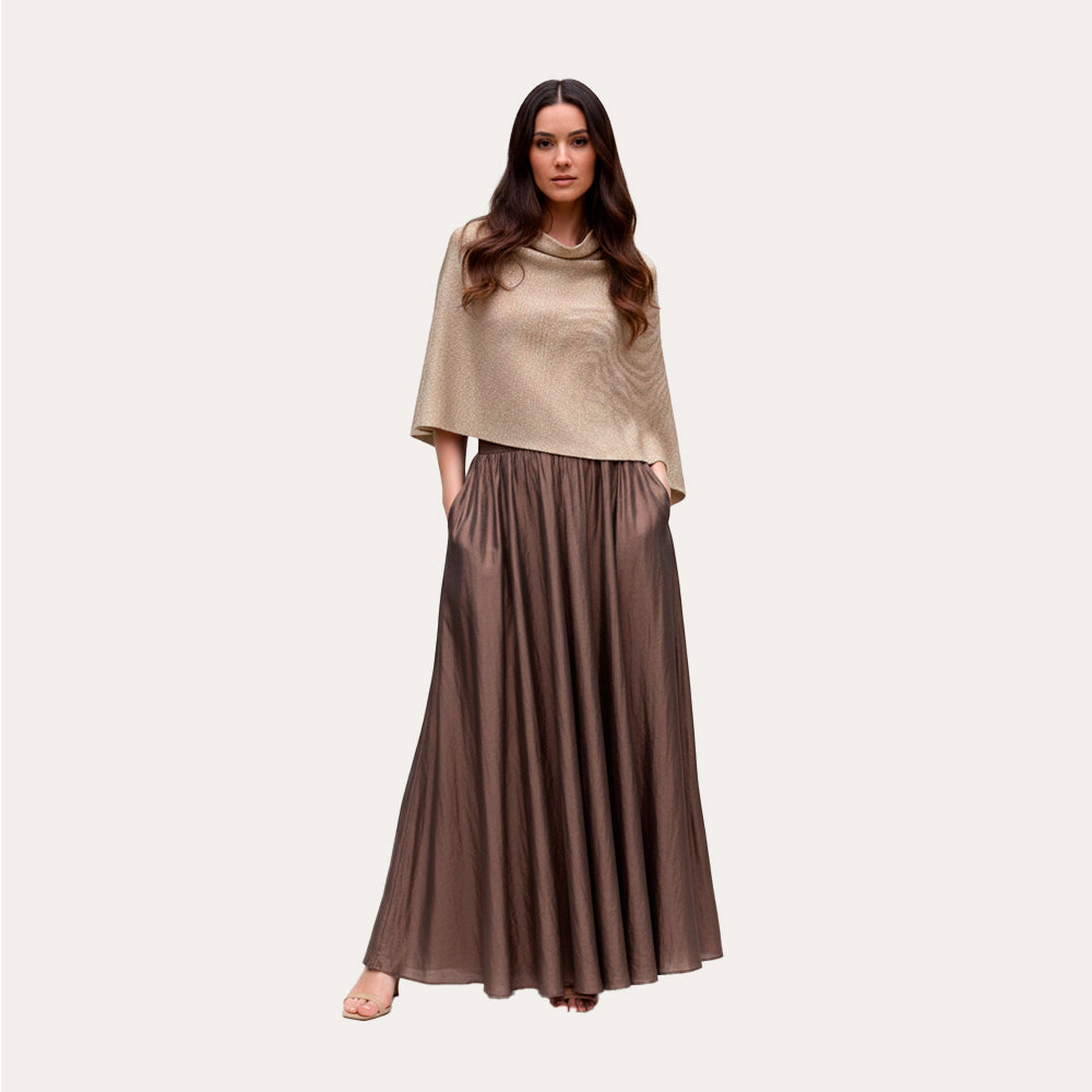 Capelet tejido en hilado 50% algodón y 50% seda, combinación que aporta suavidad, frescura y una caída fluida. El toque de lurex entrega un brillo sutil que lo hace versátil tanto para el día como para ocasiones más formales. Ligero, cómodo e ideal para esta temporada.