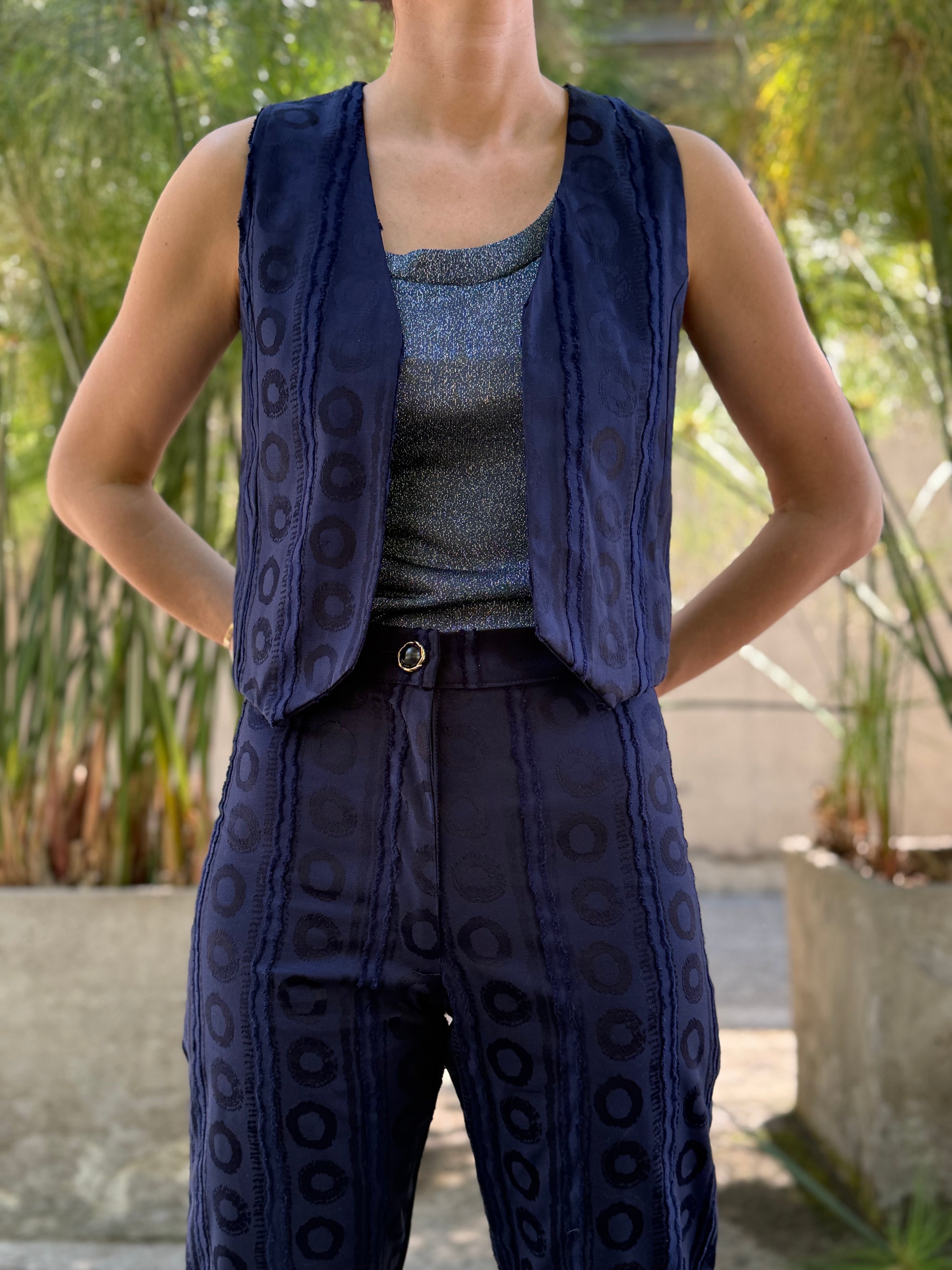 Pantalón recto de tiro alto con un calce favorecedor que realza naturalmente la figura. Su diseño colorido de lunares metalizados lo convierte en una pieza ideal para el verano, perfecta tanto para el día como para un evento. Y su composición hace que sea una prenda muy cómoda.