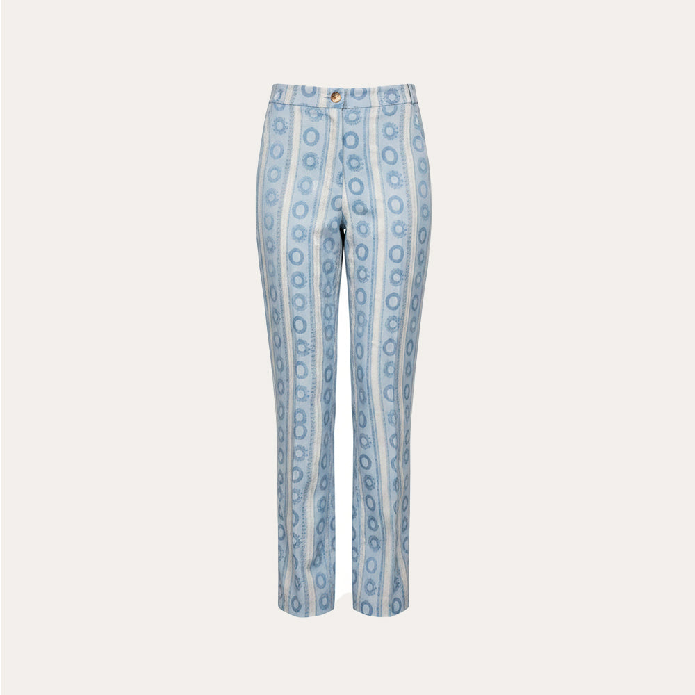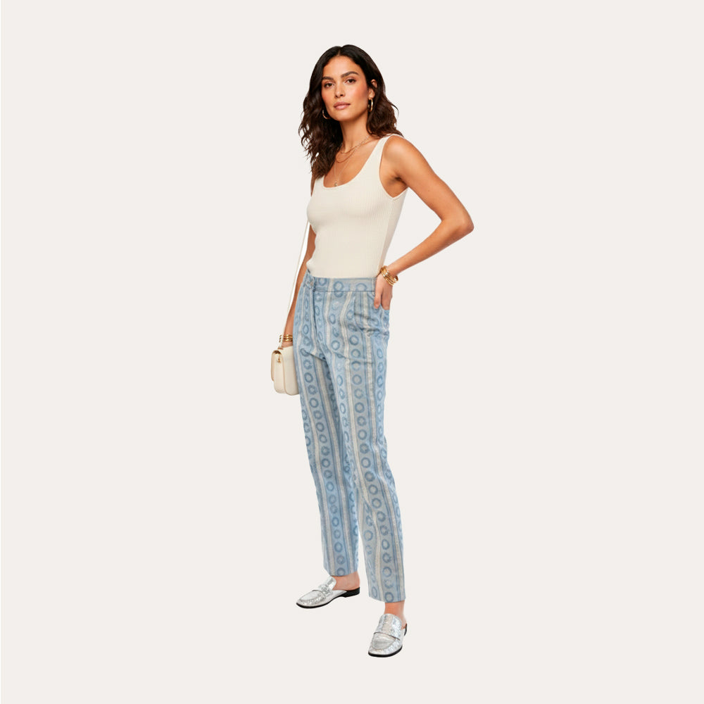 Pantalón recto de tiro alto con un calce favorecedor que realza naturalmente la figura. Su diseño colorido de lunares metalizados lo convierte en una pieza ideal para el verano, perfecta tanto para el día como para un evento. Y su composición hace que sea una prenda muy cómoda.