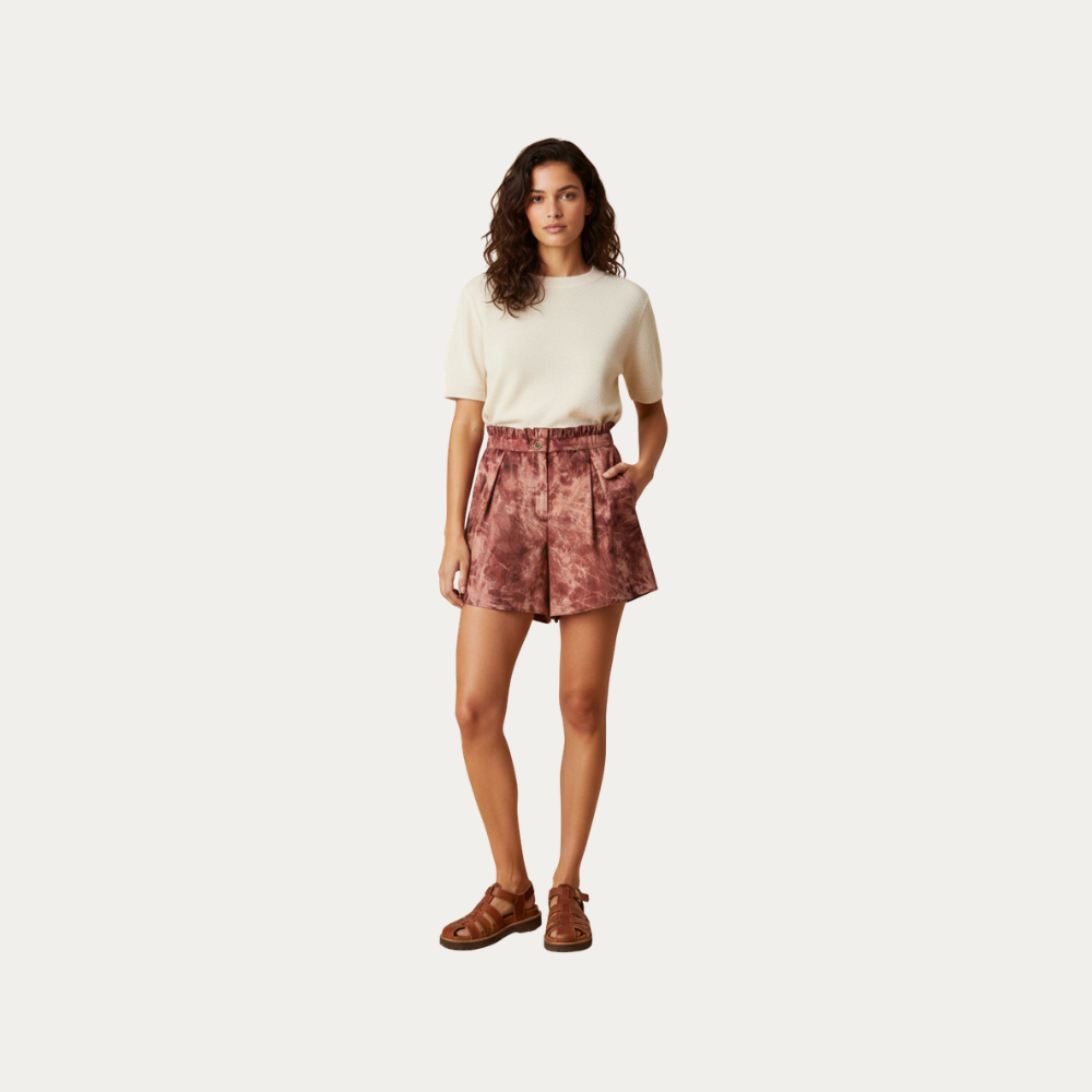 Short de tela satinada con cierre frontal y botón vintage. Presenta un ligero recogido en la cintura para un calce cómodo y acompaña a la sobrecamisa del mismo material para usar como set.